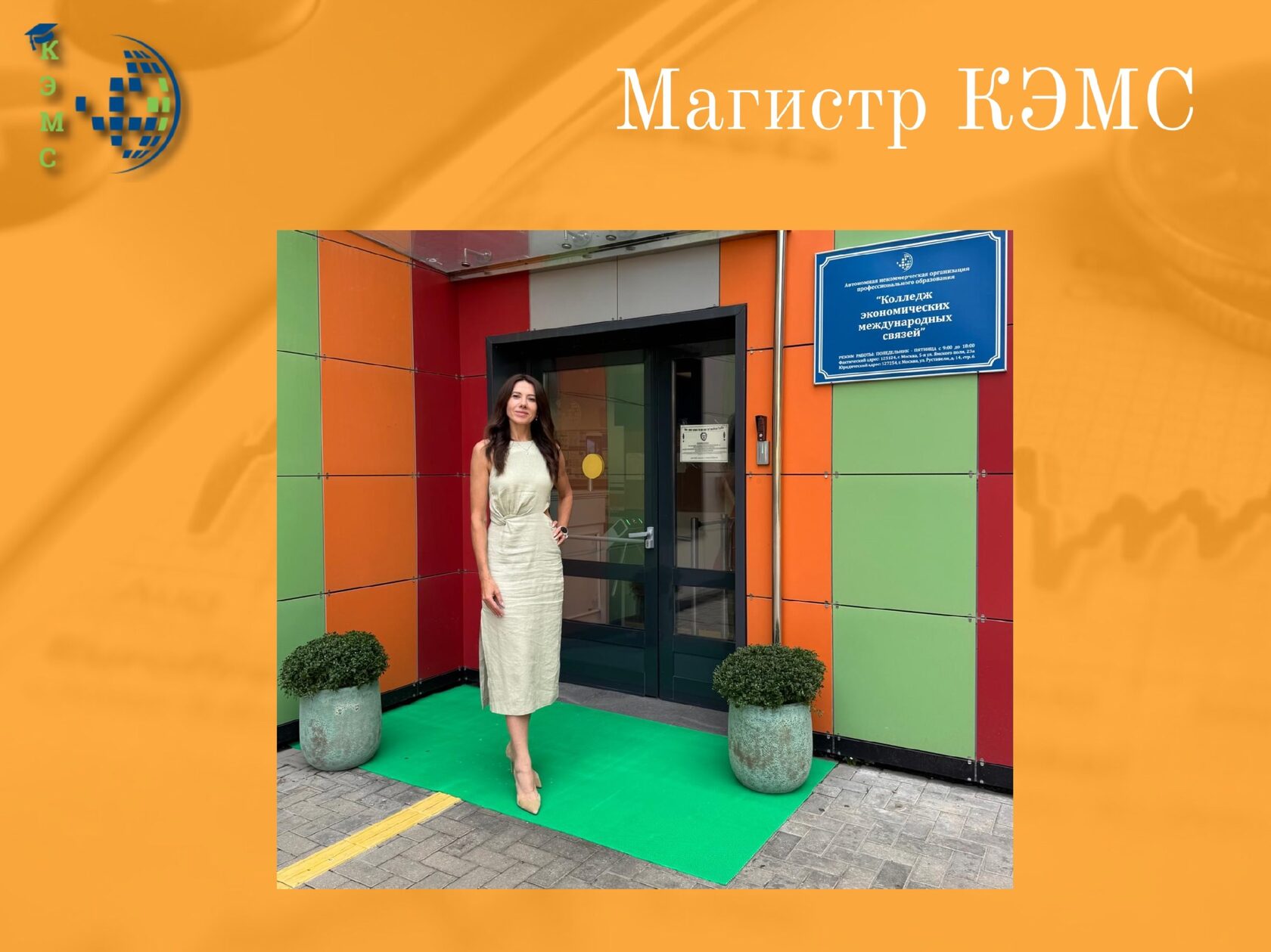 КЭМС задает высокую планку в образовании не только своим студентам. Держат ее преподаватели и администрация КЭМС и для себя. В июле очередной диплом об окончании магистратуры получила Ивонинская Оксана Александровна, заместитель директора Колледжа Экономических Международных Связей. Оксана Александровна всегда ставит себе высокие цели в работе, спорте и повышении своего профессионального портфолио и всегда их достигает!